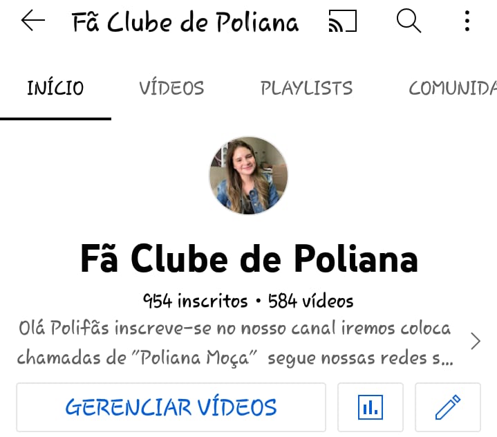 Quase 100 membros lá no canal ele esta sendo conhecido bem por conta de ser o canal que traz as noticias na hora… E o Canal de noticias de Poliana Moça e do elenco tudo sobre Poliana tudo postado lá vamos seguindo no canal